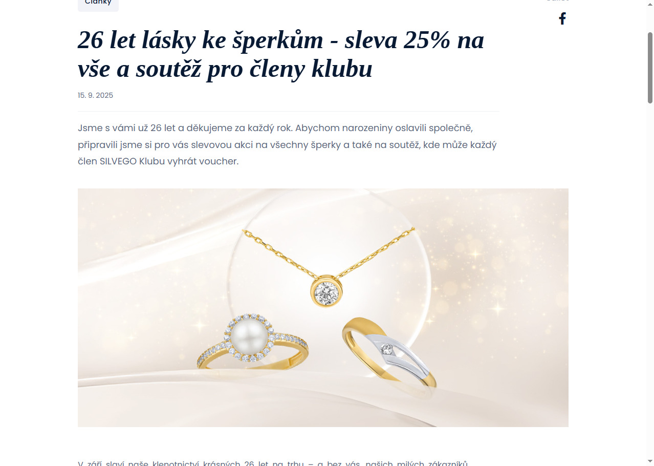 Objevte kouzlo šperků a zapojte se do naší jedinečné soutěže k příležitosti 26 let lásky ke šperkům! V roce 2025 přinášíme vzrušující online soutěže, kde máte šanci vyhrát fantastické ceny a zároveň využít slevu 25% na vše. Nepropásněte tuto skvělou příležitost, jak oslavit vášeň pro šperky a zároveň získat něco navíc! Staňte se členem klubu a vychutnejte si výhody, které soutěže nabízejí. Zapojte se ještě dnes na silvego.cz a získejte šanci na výhru, která vás okouzlí!
