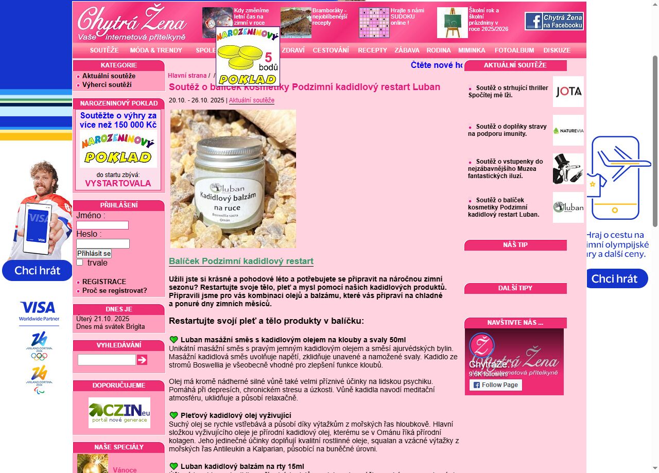 Zúčastněte se jedinečné online soutěže o balíček kosmetiky Podzimní kadidlový restart Luban! Soutěžíme o skvělé ceny a vítězové budou mít možnost vyzkoušet kvalitní produkty, které oživí jejich podzimní péči o pleť. Objevte kouzlo soutěží na internetu a přidejte se k nám. Nepropásněte šanci stát se jedním z výherců této atraktivní soutěže!