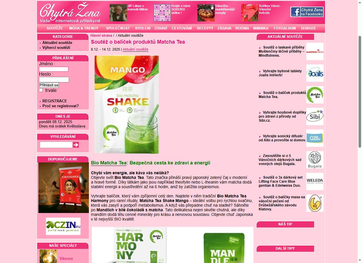 Zapojte se do vzrušující online soutěže o balíček produktů Matcha Tea! Na chytrazena.cz soutěžíme o skvělé ceny a hledáme výherce, kteří si užijí jedinečné produkty. Nechte se inspirovat a objevte kouzlo soutěží na internetu. Nezmeškejte šanci stát se jedním z šťastných výherců!