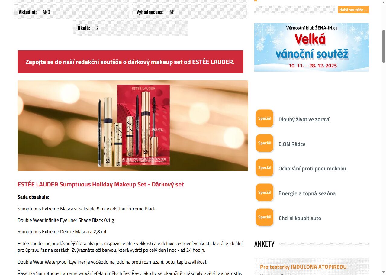 Vyhrajte exkluzivní dárkový makeup set od ESTÉE LAUDER! Připojte se k naší vzrušující spotřebitelské soutěži 2025 a zažijte kouzlo kvalitní kosmetiky na vlastní pleti. Soutěžíme o skvělé ceny, které potěší každou milovnici krásy. Nezmeškejte příležitost, zapojit se můžete snadno a rychle na zena-in.cz. Buďte mezi šťastnými výherci a objevte nové možnosti, jak podtrhnout svou krásu s produkty od ESTÉE LAUDER. Soutěžte s námi a nechte se hýčkat!