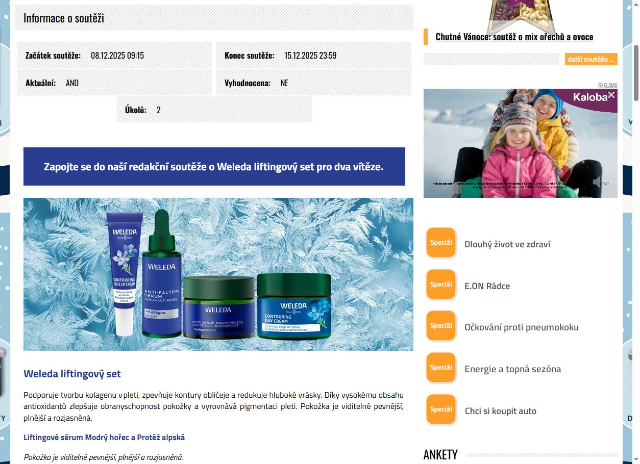 Zapojte se do naší vzrušující soutěže o Weleda liftingový set a objevte kouzlo přírodní kosmetiky! Tato soutěž na internetu je skvělou příležitostí, jak vyhrát luxusní produkty, které zkrášlí vaši pleť a dodají jí mladistvý vzhled. Nezmeškejte šanci účastnit se aktuálních soutěží a přidejte se k nám na zena-in.cz. Soutěžíme pro vás, abyste mohli zažít krásu a péči, kterou si zasloužíte. Vyhrajte a osvěžte svou beauty rutinu s Weleda!