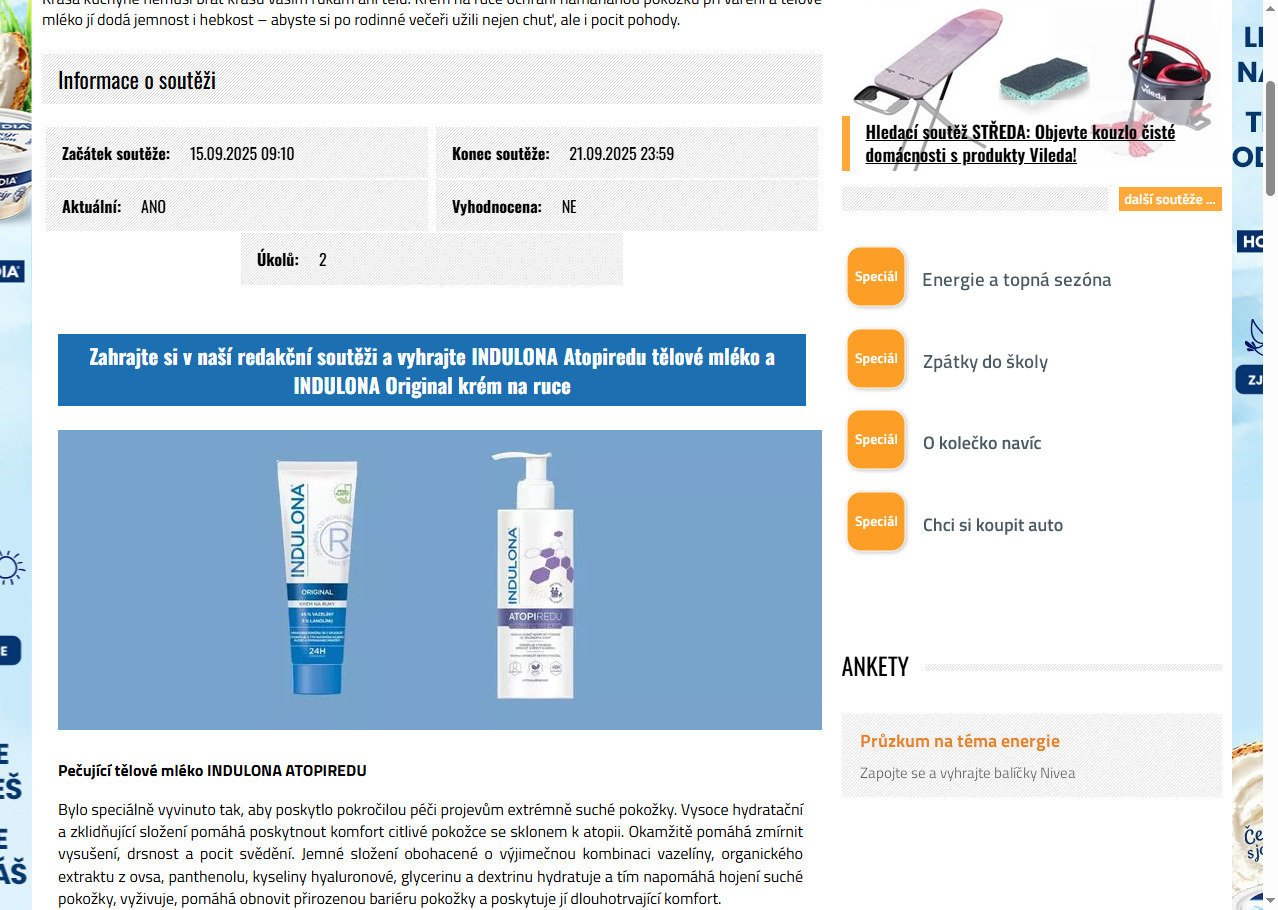 Zapojte se do naší vzrušující soutěže a vyhrajte omlazující sadu od INDULONA! Objevte kouzlo péče o pleť a získejte šanci na skvělé ceny, které vás osvěží a dodají vám mladistvý vzhled. Tato internetová soutěž je ideální příležitostí, jak si dopřát zaslouženou péči. Nečekejte a zapojte se ještě dnes na zena-in.cz! Využijte možnost vyhrát a změnit svou každodenní rutinu v něco výjimečného. Soutěže jako tato přinášejí radost a překvapení, tak neváhejte a zkuste své štěstí!