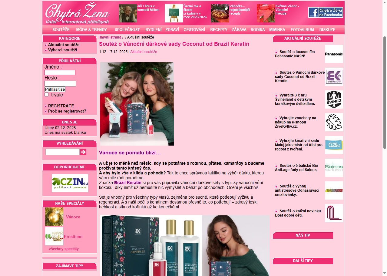 Zúčastněte se vzrušující online soutěže o Vánoční dárkové sady Coconut od Brazil Keratin! Tato soutěž nabízí skvělou příležitost pro všechny milovníky krásy a péče o vlasy. Soutěžíme o hodnotné ceny, které potěší každého, kdo hledá kvalitní produkty pro svou vlasovou péči. Nepropásněte šanci stát se jedním z výherců a objevte kouzlo soutěží na internetu. Zapojit se může opravdu každý, tak neváhejte a vyzkoušejte své štěstí!