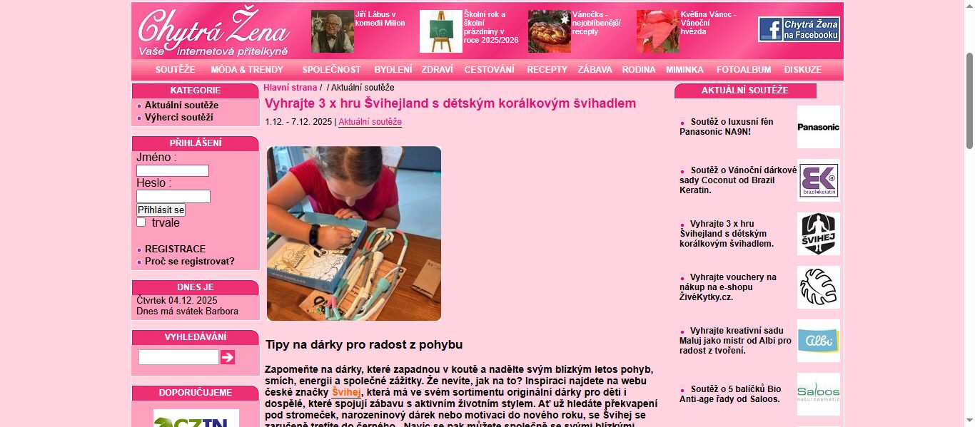 Zapojte se do vzrušující online soutěže a vyhrajte 3 x hru Švihejland spolu s dětským korálkovým švihadlem! Soutěžíme o skvělé ceny, které potěší nejen děti, ale i jejich rodiče. Na chytrazena.cz se můžete těšit na další soutěže na internetu, kde se stanete součástí komunity výherců. Nepropásněte šanci na výhru a užijte si zábavu při soutěžení!