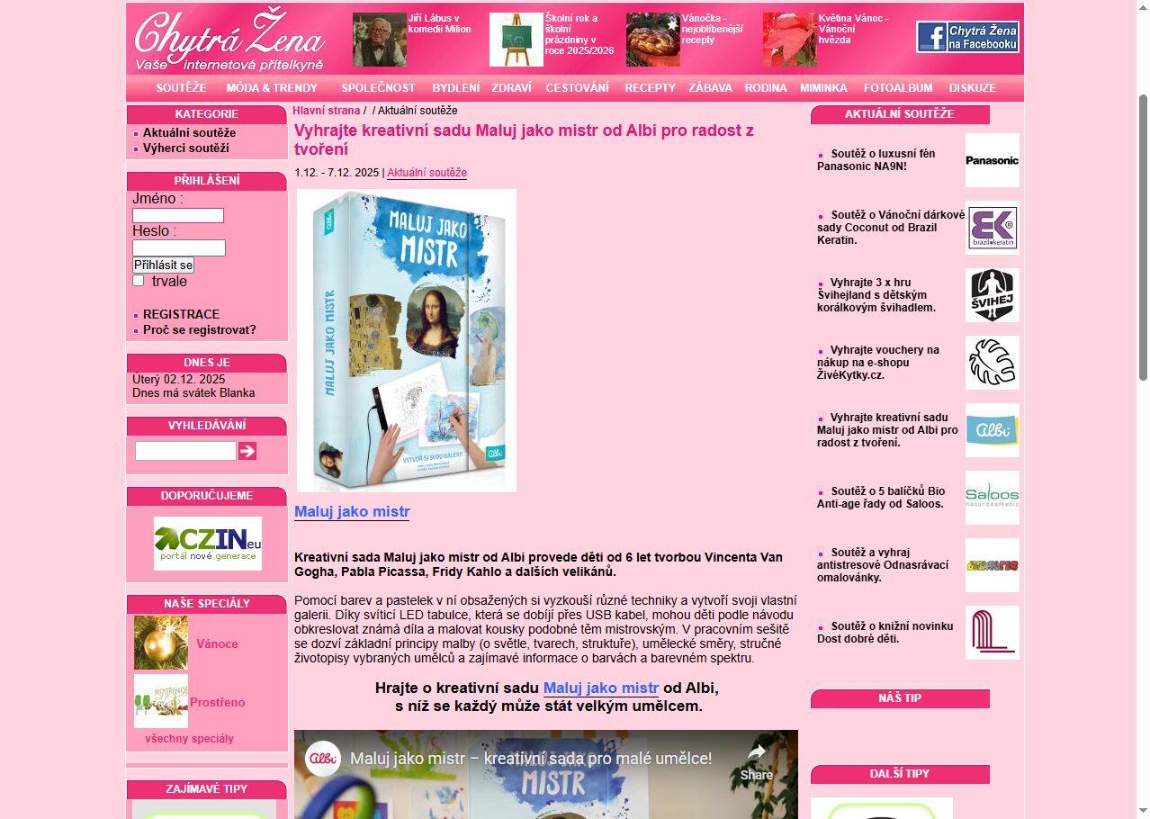 Zúčastněte se vzrušující online soutěže a vyhrajte kreativní sadu Maluj jako mistr od Albi! Tato soutěž nabízí jedinečnou příležitost pro všechny nadšence do tvoření, kteří chtějí ukázat svůj talent. Soutěžíme o skvělé ceny a každý účastník má šanci stát se výhercem. Nepropásněte tuto skvělou příležitost a zapojte se do soutěže, která přináší radost a inspiraci. Objevte kouzlo soutěží na internetu a ukažte, co ve vás je!