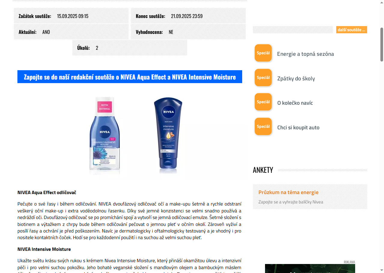 Zúčastněte se naší vzrušující soutěže 2025 a vyhrajte skvělou pokožkovou sadu od NIVEA! Tento jedinečný balíček je navržen tak, aby vaší pleti dodal tu nejlepší péči a hydrataci. Nezmeškejte šanci vyhrát, soutěžíme o luxusní produkty, které si zamilujete. Zapojte se ještě dnes a objevte, jak snadno můžete získat krásnější pleť s NIVEA! Každý den je příležitostí k vítězství, tak neváhejte a přidejte se k nám!